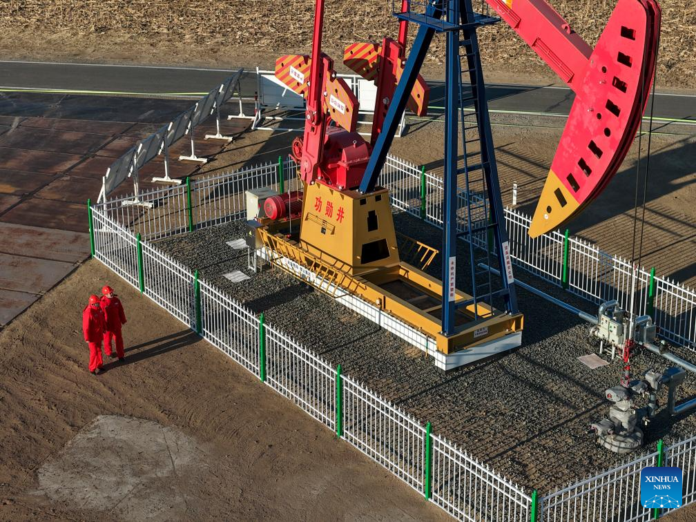 An aerial drone photo shows a view of a national-level demonstration zone of continental shale oil of Daqing Oilfield in Daqing, northeast China's Heilongjiang Province, Dec. 4, 2025. Daqing Oilfield, one of China's largest energy production bases, announced Friday that the yearly output of the shale oil in the demonstration zone has exceeded one million tonnes. (Xinhua/Wang Song)