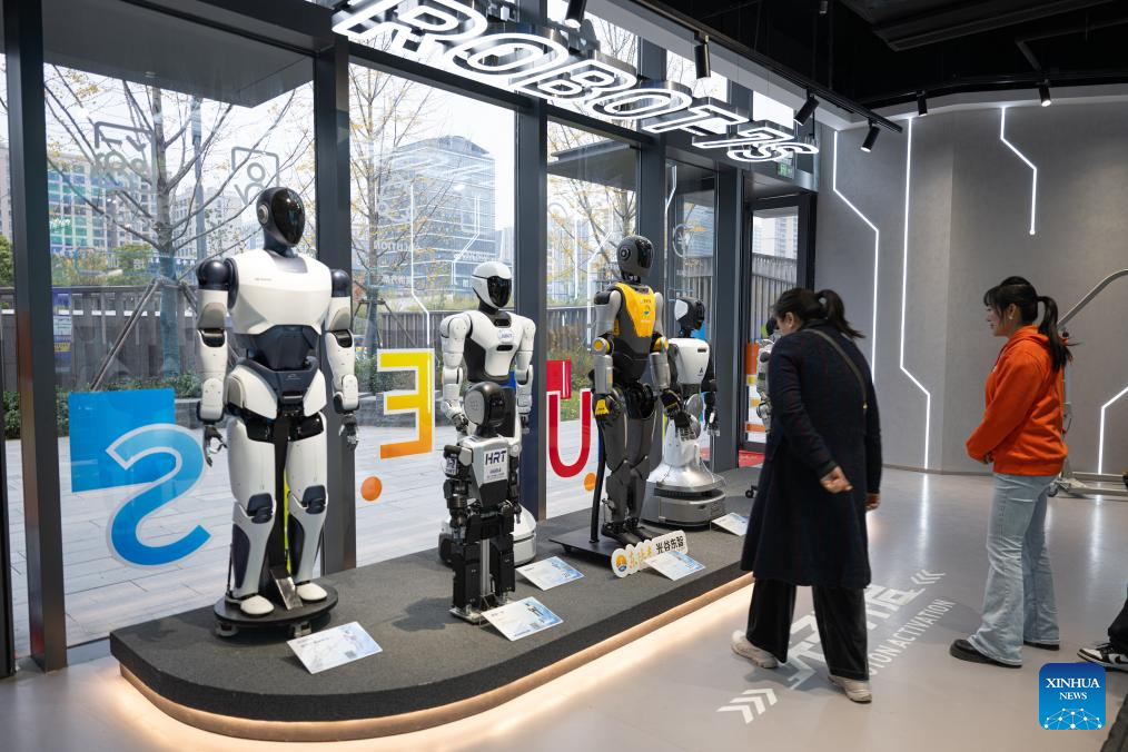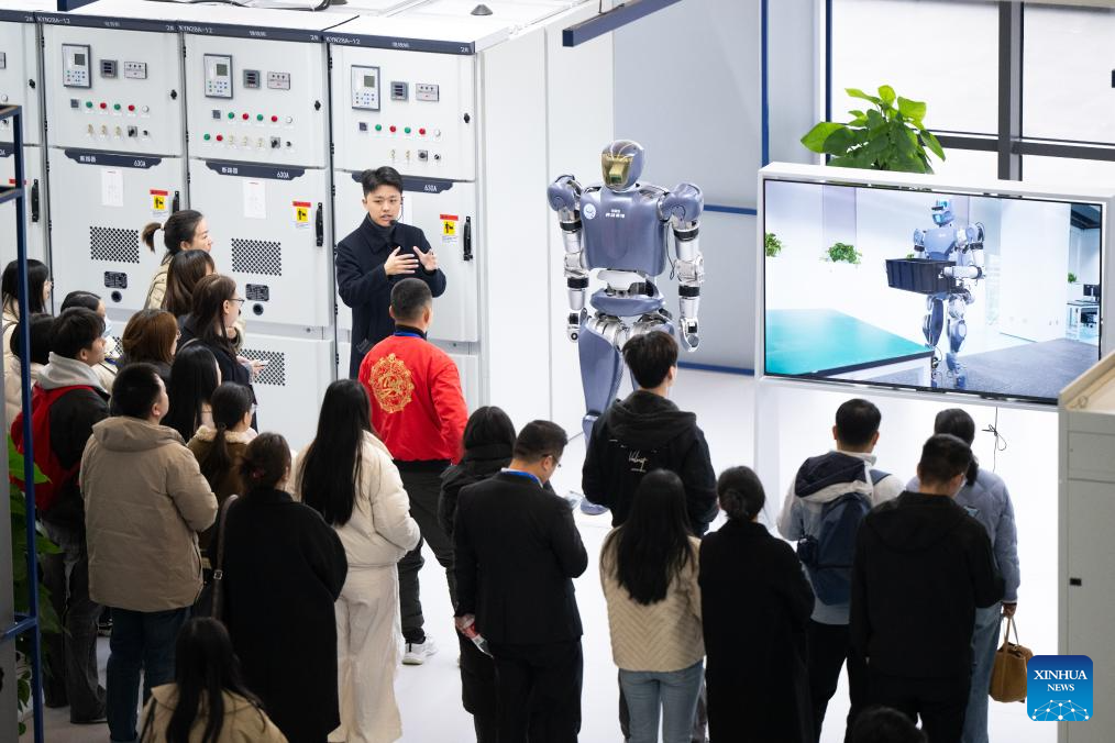 People visit a humanoid robot innovation center in Wuhan East Lake High-tech Development Zone, also known as the optics valley of China, in Wuhan, central China's Hubei Province, Dec. 4, 2025. Relying on its scientific and educational resources as well as manufacturing advantages, Hubei is accelerating the layout of its humanoid robot industry chain this year.