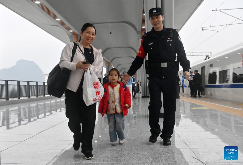 A staff member guides the passengers to board a train at Pingxiang East Railway Station, in Pingxiang City, south China's Guangxi Zhuang Autonomous Region, on Dec. 5, 2025. The Chongzuo-Pingxiang section of the Nanning-Pingxiang Railway began operation on Friday, marking the full operation of the high-speed railway, which connects the region's capital city Nanning to the border city Pingxiang. (Xinhua/Lu Boan)