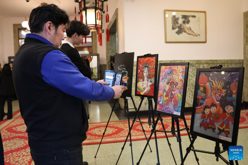 People view an art exhibition during an open day event held at the Chinese Embassy in Mongolia, in Ulan Bator, Mongolia, Dec. 5, 2025. The Embassy of China in Mongolia on Friday hosted an open day event, which was attended by more than 200 primary and secondary school teachers, students and parents in Ulan Bator. (Xinhua/Bolortsetseg)