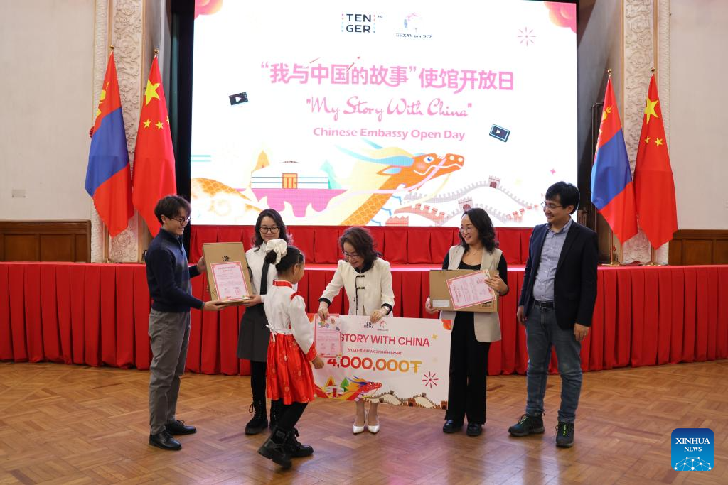The award ceremony for the short video competition "My Story with China" is held at the Chinese Embassy in Mongolia, in Ulan Bator, Mongolia, Dec. 5, 2025. The Embassy of China in Mongolia on Friday hosted an open day event, which was attended by more than 200 primary and secondary school teachers, students and parents in Ulan Bator. (Xinhua/Bolortsetseg)