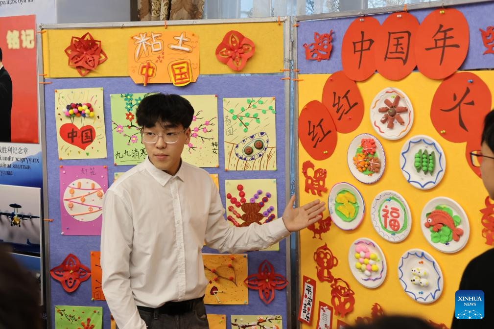A Mongolian student displays his artwork during an open day event held at the Chinese Embassy in Mongolia, in Ulan Bator, Mongolia, Dec. 5, 2025. The Embassy of China in Mongolia on Friday hosted an open day event, which was attended by more than 200 primary and secondary school teachers, students and parents in Ulan Bator. (Xinhua/Bolortsetseg)