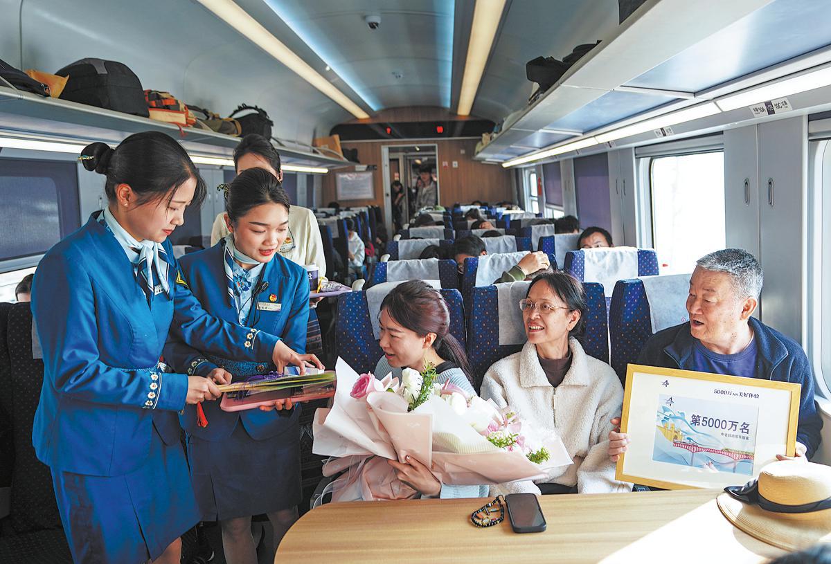 Train attendants present Sun Yiwei (center), the 50 millionth passenger on the China-Laos Railway, with a gift on March 28. CHEN XINBO/XINHUA