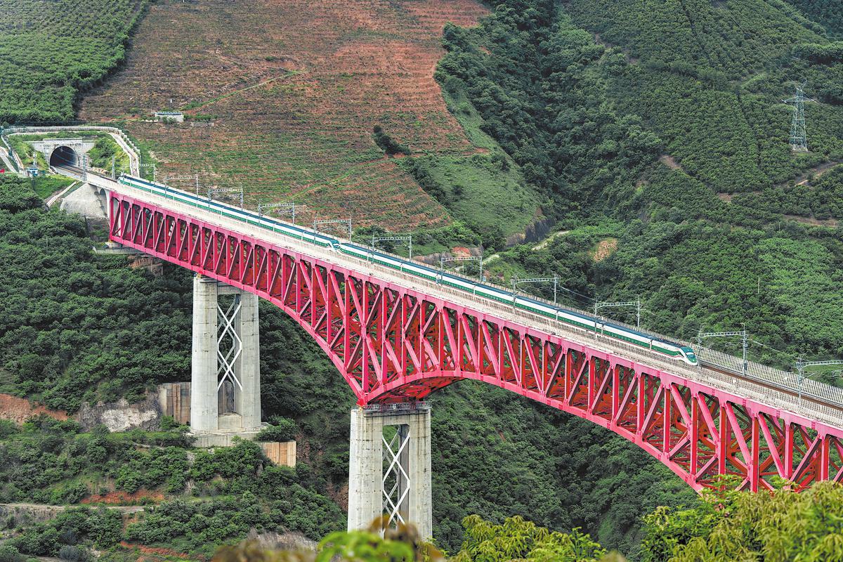 A passenger train passes a bridge on the China-Laos Railway over the Yuanjiang River in Yuxi, Yunnan, on July 30. MA HONGHAI/FOR CHINA DAILY