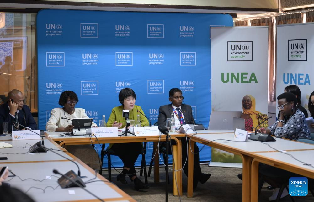 Guo Fang (3rd L), Chinese vice minister of ecology and environment, speaks at a press conference on the Chinese-backed Kunming Biopersity Fund (KBF) on the sidelines of the seventh session of the United Nations Environment Assembly in Nairobi, Kenya, Dec 10, 2025. (Xinhua/Yang Guang)