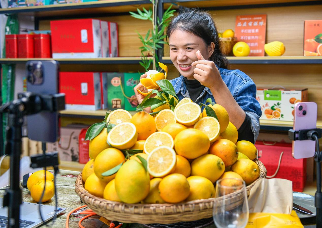 A host sells oranges via livestream in Daoxian county, Yongzhou, central China's Hunan province. (Photo/Jiang Keqing)