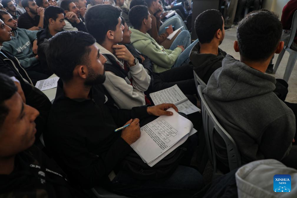 Palestinian students attend a lesson at Islamic University, in Gaza City, Dec. 7, 2025. (Photo by Rizek Abdeljawad/Xinhua)