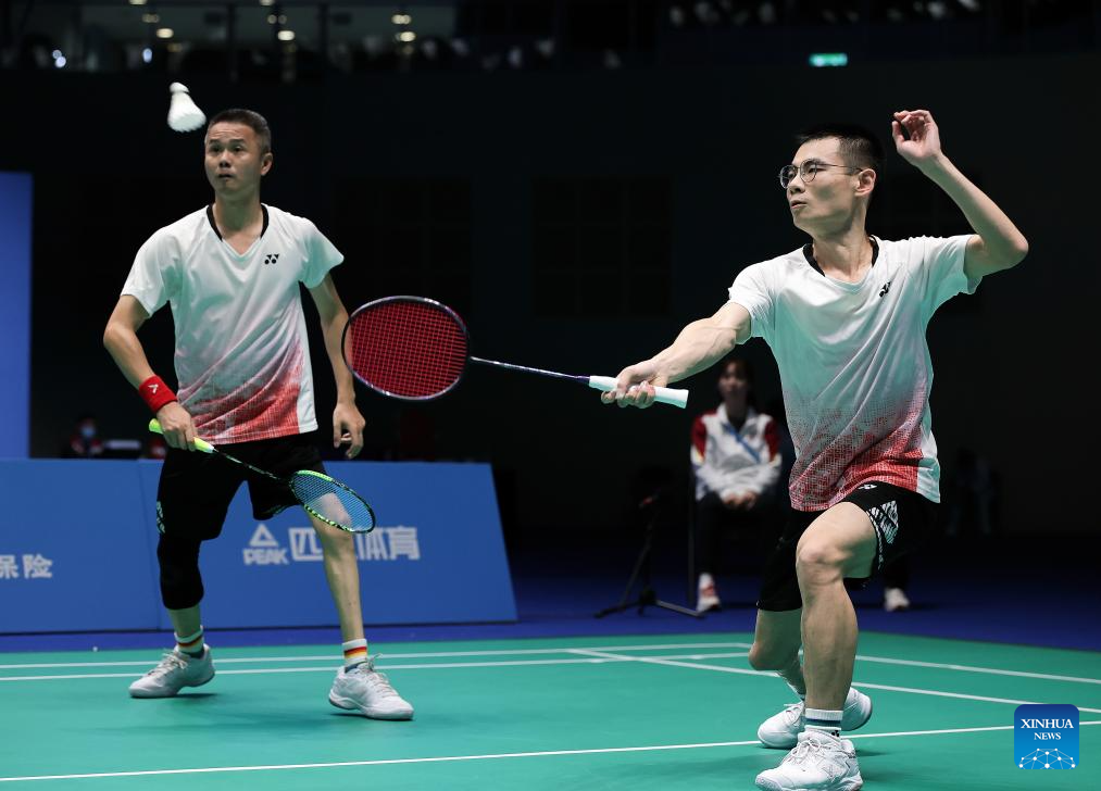 (251211) -- MACAO, Dec. 11, 2025 (Xinhua) -- Chen Pengfei (R)/Huang Qiyu of Fujian compete during the men's doubles SL3-SL4 group 2 match of para badminton at China's 12th National Games for Persons with Disabilities and the 9th National Special Olympic Games in Macao, China, Dec. 11, 2025. (Xinhua/Mao Siqian)