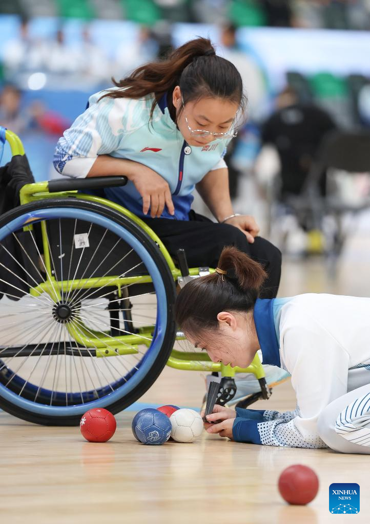 Meng Hui (R) of Sichuan competes during the women's individual BC2 semifinals of boccia at China's 12th National Games for Persons with Disabilities and the 9th National Special Olympic Games in Hong Kong, south China, Dec. 11, 2025. (Xinhua/Lu Hanxin)