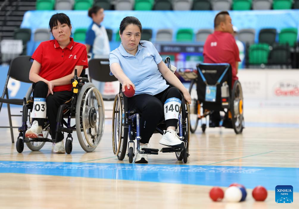 Zhan Xia (R) of Guangdong competes during the women's individual BC4 semifinals of boccia at China's 12th National Games for Persons with Disabilities and the 9th National Special Olympic Games in Hong Kong, south China, Dec. 11, 2025. (Xinhua/Lu Hanxin)