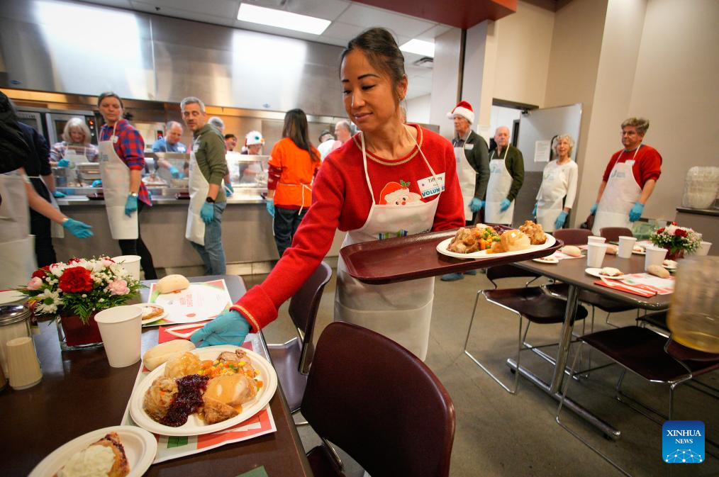 A volunteer serves food during the annual Christmas meal event in Vancouver, British Columbia, Canada, on Dec. 12, 2025. (Photo by Liang Sen/Xinhua)
