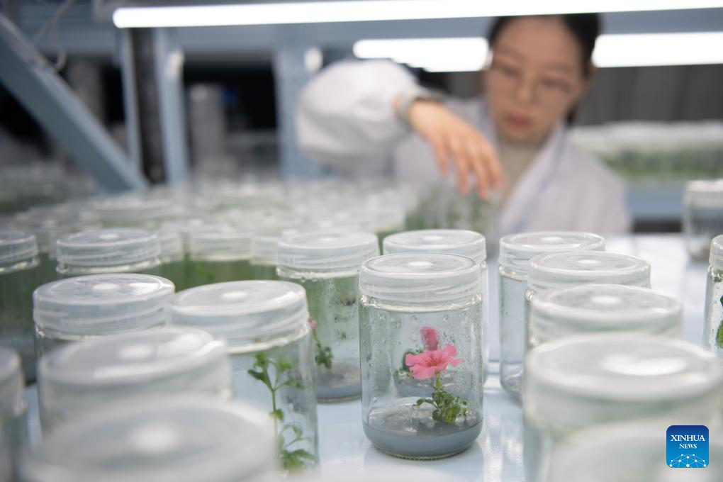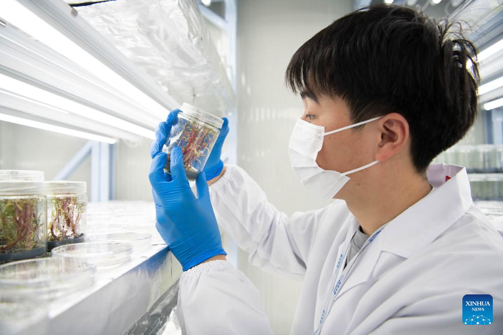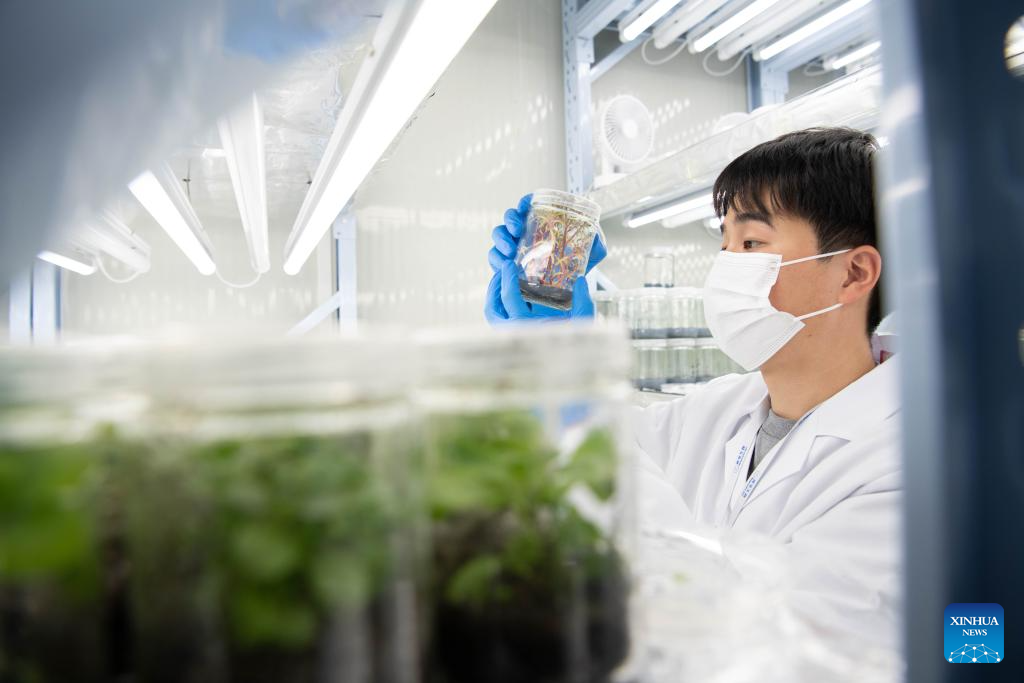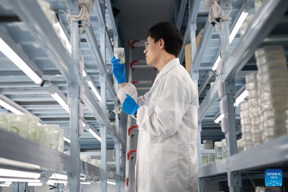 A reseacher checks the growth of seedlings at the laboratory of Magicpen Bio in Hefei, east China's Anhui Province, Dec. 3, 2025. Chinese researchers have successfully cultivated a number of gene-edited plants that steadily glimmer in dark environments. They managed to introduce gene fragments from organisms such as fireflies into plant cells, allowing the latter to glimmer by themselves. (Xinhua/Zhang Duan)