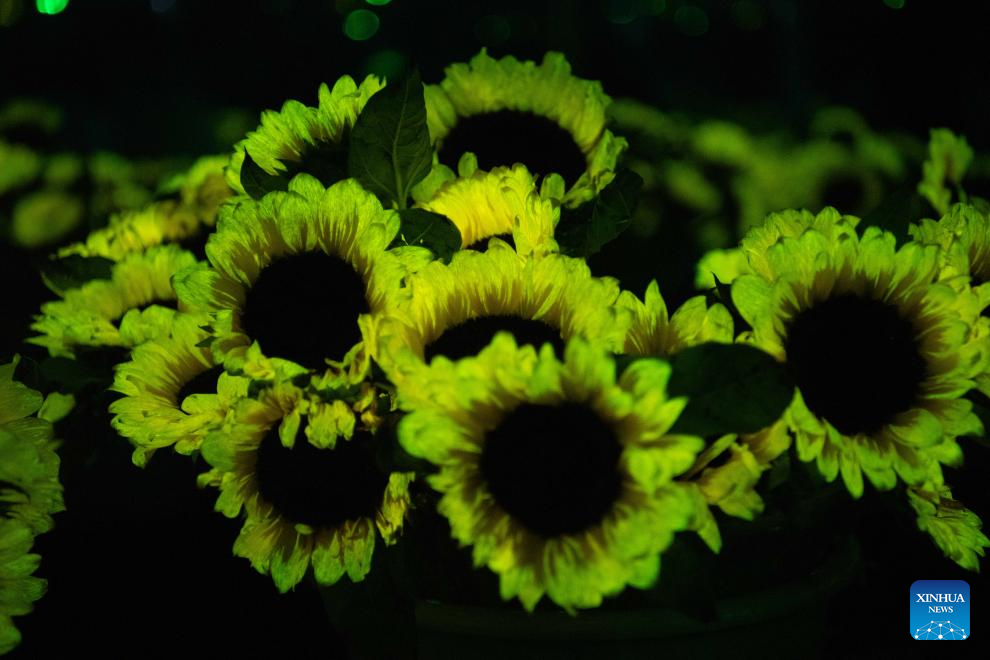 This photo taken on Dec. 3, 2025 shows self-glimmering sunflowers cultivated by Magicpen Bio in Hefei, east China's Anhui Province. Chinese researchers have successfully cultivated a number of gene-edited plants that steadily glimmer in dark environments. They managed to introduce gene fragments from organisms such as fireflies into plant cells, allowing the latter to glimmer by themselves. (Xinhua/Zhang Duan)