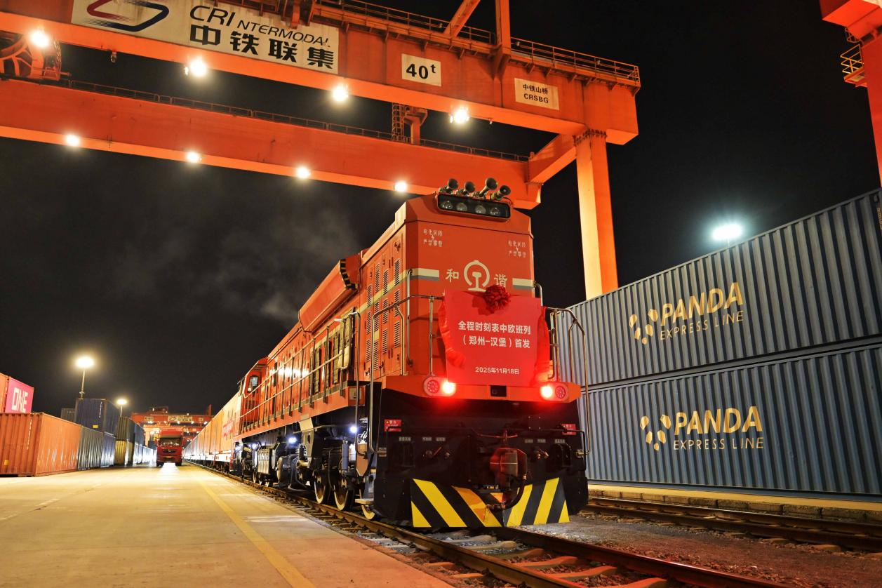 The first China-Europe freight train operating under the full timetable service model in Zhengzhou, central China's Henan province, X8003, is about to depart, Nov. 18, 2025. (Photo/Wang Wei)
