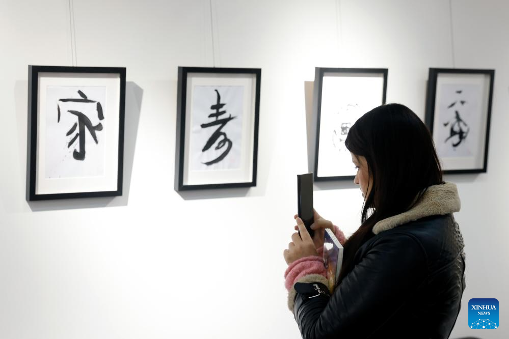 A visitor takes pictures of Chinese traditional calligraphy during the opening day of the 4th edition of the Buchina Book Fair at the China Cultural Center in Bucharest, Romania, Dec. 13, 2025. Buchina is a book fair dedicated to Chinese literature, culture and art. (Photo by Cristian Cristel/Xinhua)