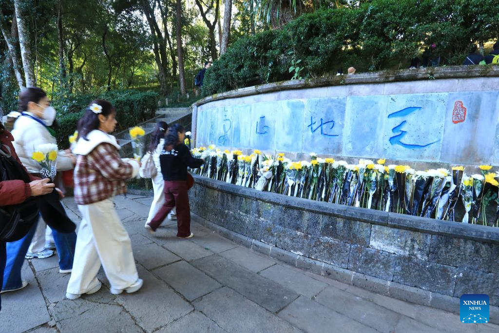 People pay tributes to martyrs at a monument of a memorial hall for the Chinese People's War of Resistance against Japanese Aggression in western Yunnan, in Tengchong, southwest China's Yunnan Province, Dec. 13, 2025. The 12th national memorial day was observed on Saturday across the country to honor about 300,000 victims killed by Japanese troops during the Nanjing Massacre, in a year that marks the 80th anniversary of the end of World War II (WWII). (Photo by Gong Zujin/Xinhua)