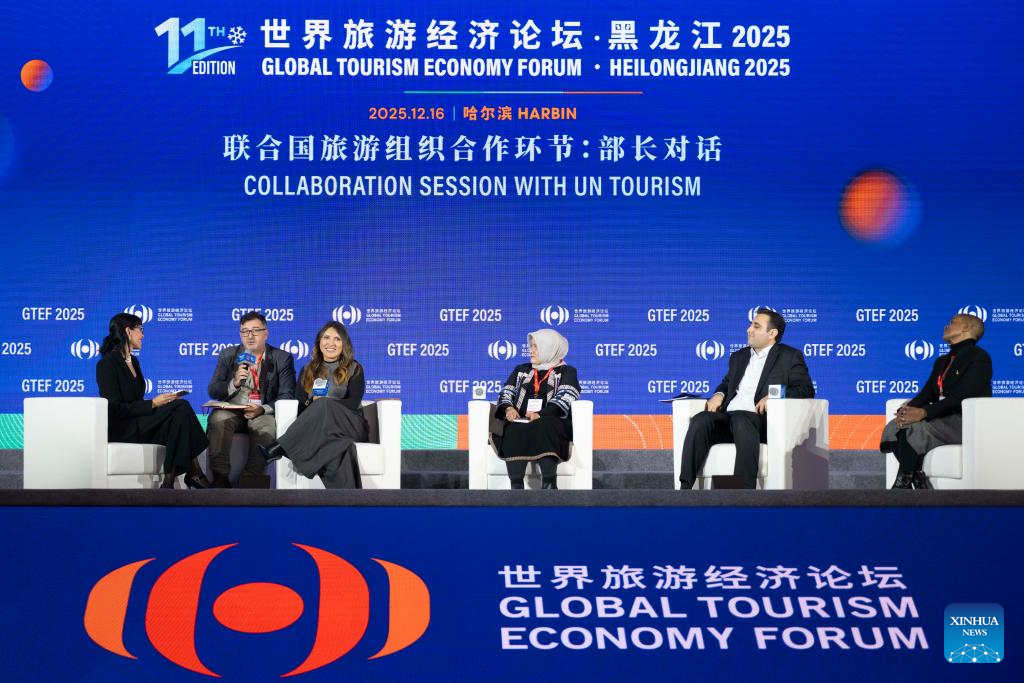 This photo taken on Dec. 16, 2025 shows a collaboration session with UN Tourism during the Global Tourism Economy Forum in Harbin, northeast China's Heilongjiang Province. The forum kicked off here on Tuesday, attended by participants from over 30 countries and regions. (Xinhua/Zhang Tao)