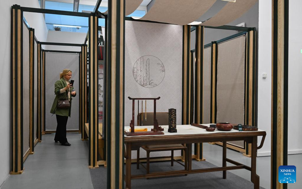 A visitor views exhibits during an exhibition titled "Anshan Cuijin - an Exhibition of Chinese Life Aesthetics" at the China Cultural Center in Madrid, Spain, Dec. 16, 2025. The exhibition kicked off here on Tuesday and will run until March 2026, presenting the elegant charm of Chinese aesthetics. (Xinhua/Cheng Min)