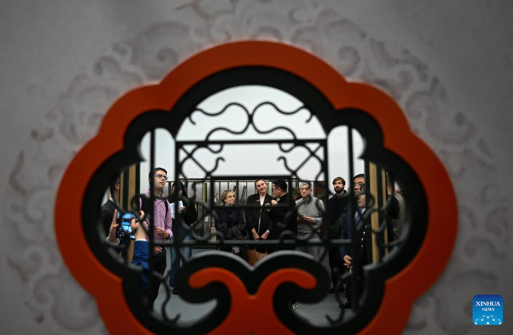 Visitors listen to an introduction on exhibits during an exhibition titled "Anshan Cuijin - an Exhibition of Chinese Life Aesthetics" at the China Cultural Center in Madrid, Spain, Dec. 16, 2025. The exhibition kicked off here on Tuesday and will run until March 2026, presenting the elegant charm of Chinese aesthetics. (Xinhua/Cheng Min)