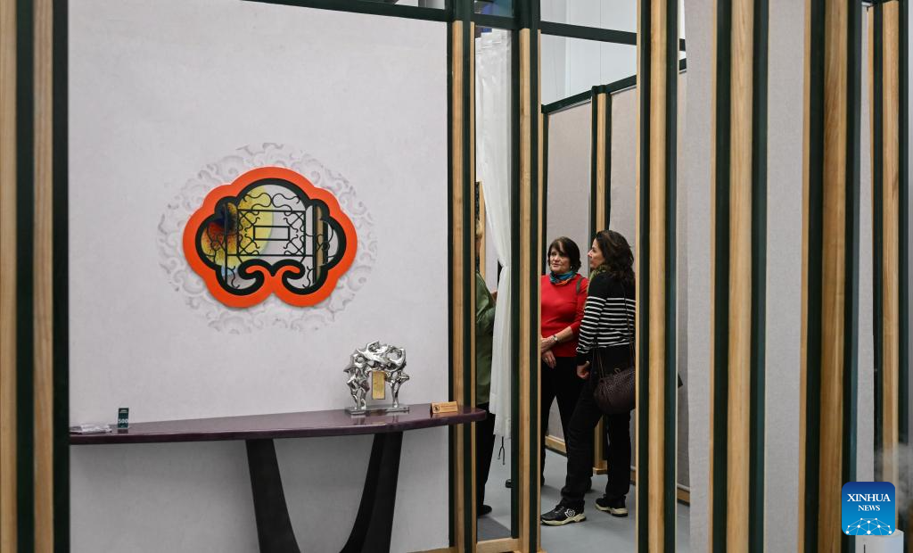Visitors view exhibits during an exhibition titled "Anshan Cuijin - an Exhibition of Chinese Life Aesthetics" at the China Cultural Center in Madrid, Spain, Dec. 16, 2025. The exhibition kicked off here on Tuesday and will run until March 2026, presenting the elegant charm of Chinese aesthetics. (Xinhua/Cheng Min)