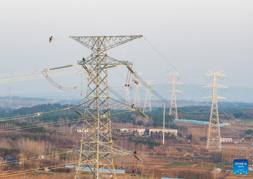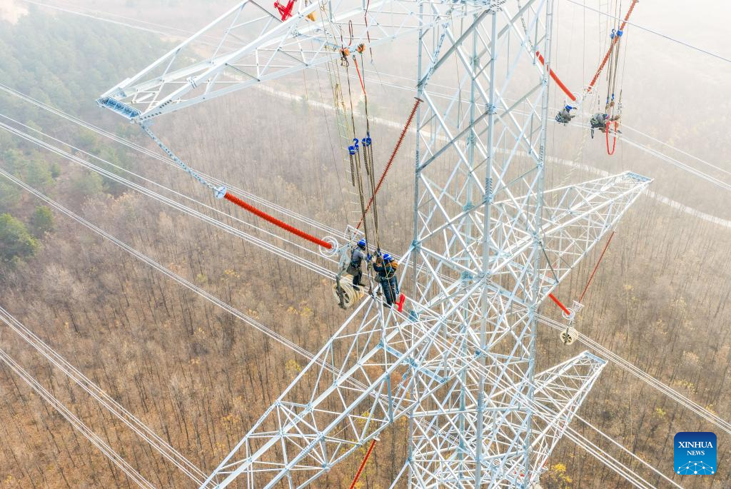 A drone photo taken on Dec. 16, 2025 shows constructors working on a power transmission line in east China's Anhui Province. The main-body construction of the 500-kV power transmission line from Xiangjian to Ludao in Anhui Province was successfully completed on Wednesday. With a total length of 136.8 kilometers, the line will further optimize the power grid structure of Anhui and enhance power supply reliability upon completion. (Photo by Zheng Xianlie/Xinhua)