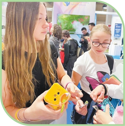 Local young visitors try out plush toys by Cozy World at the 2025 Torino International Book Fair in Italy. (Photo/Wei Hualiang)