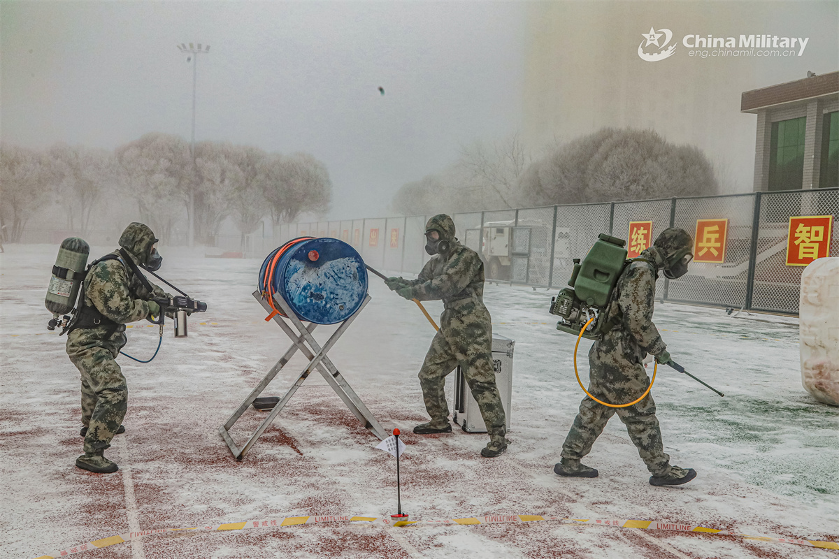 Soldiers assigned to a regiment under the Chinese PLA Army decontaminate road during a Chemical, Biological, Radioactive and Nuclear (CBRN) decontamination drill. (eng.chinamil.com.cn/Photo by Zeng Cunjun)