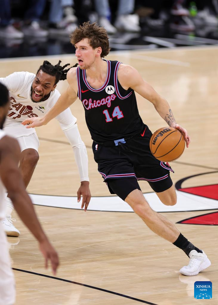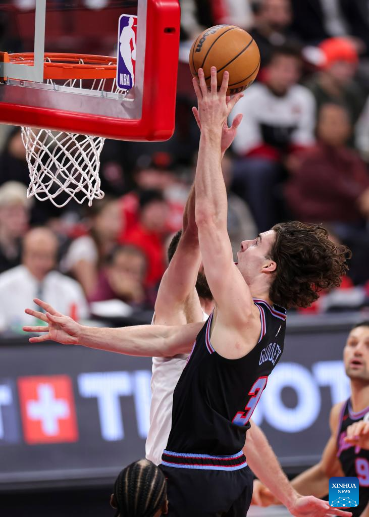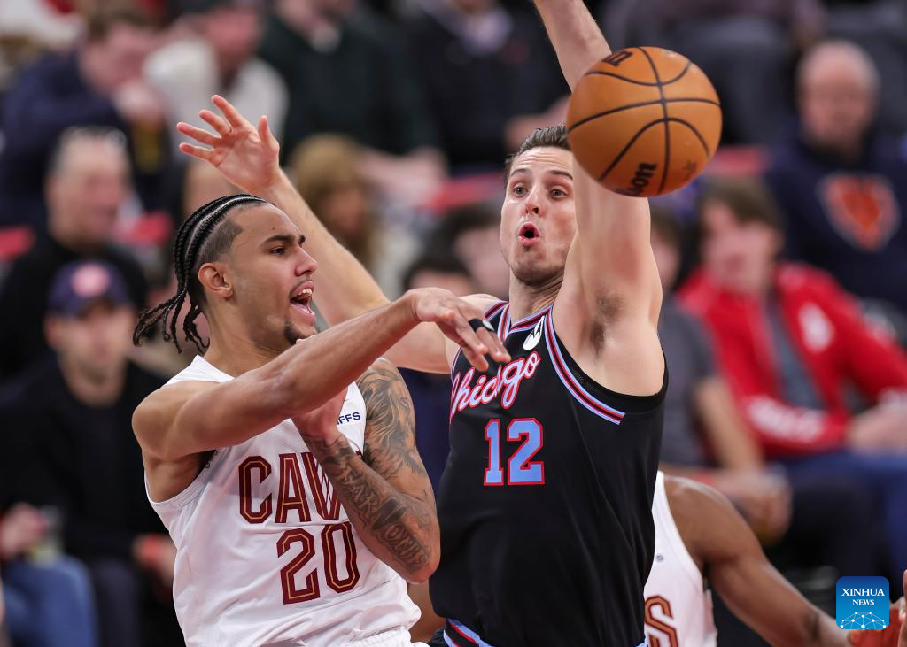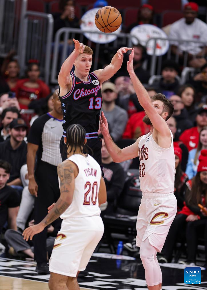 Chicago Bulls' Kevin Huerter (top) passes the ball during the 2025-2026 NBA regular season match between Chicago Bulls and Cleveland Cavaliers in Chicago, the United States, on Dec. 17, 2025. (Photo by Joel Lerner/Xinhua)