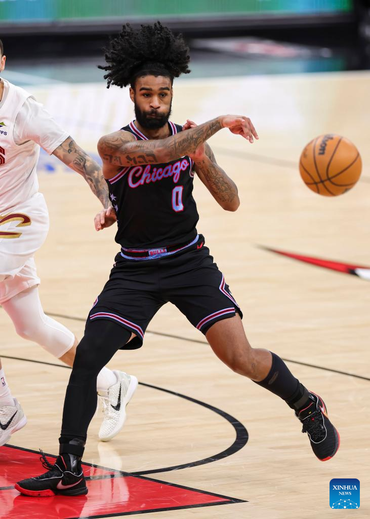 Chicago Bulls' Coby White passes the ball during the 2025-2026 NBA regular season match between Chicago Bulls and Cleveland Cavaliers in Chicago, the United States, on Dec. 17, 2025. (Photo by Joel Lerner/Xinhua)