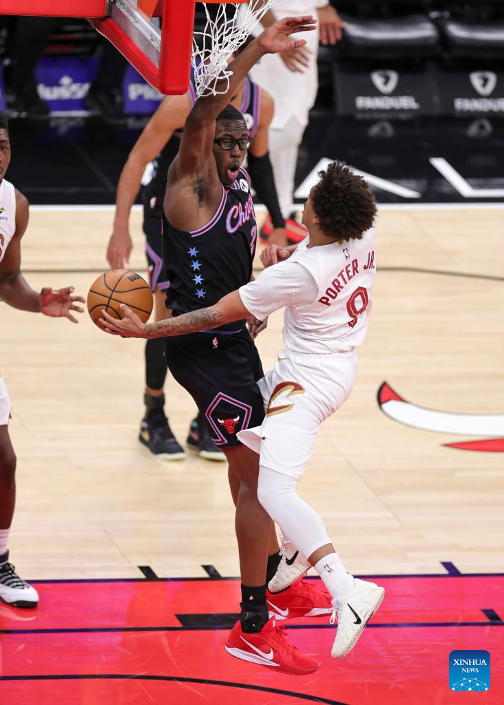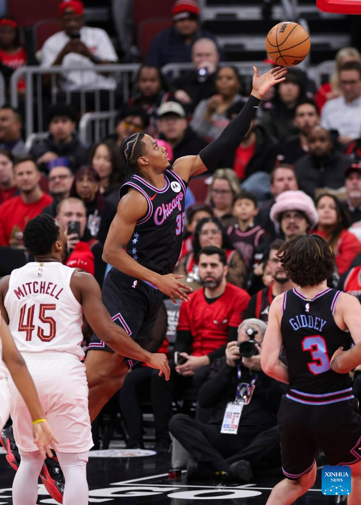 Chicago Bulls' Isaac Okoro (top) goes to the basket during the 2025-2026 NBA regular season match between Chicago Bulls and Cleveland Cavaliers in Chicago, the United States, on Dec. 17, 2025. (Photo by Joel Lerner/Xinhua)