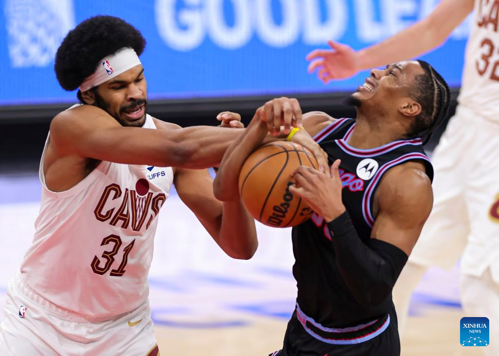 Cleveland Cavaliers' Jarrett Allen (L) vies with Chicago Bulls' Isaac Okoro during the 2025-2026 NBA regular season match between Chicago Bulls and Cleveland Cavaliers in Chicago, the United States, on Dec. 17, 2025. (Photo by Joel Lerner/Xinhua)