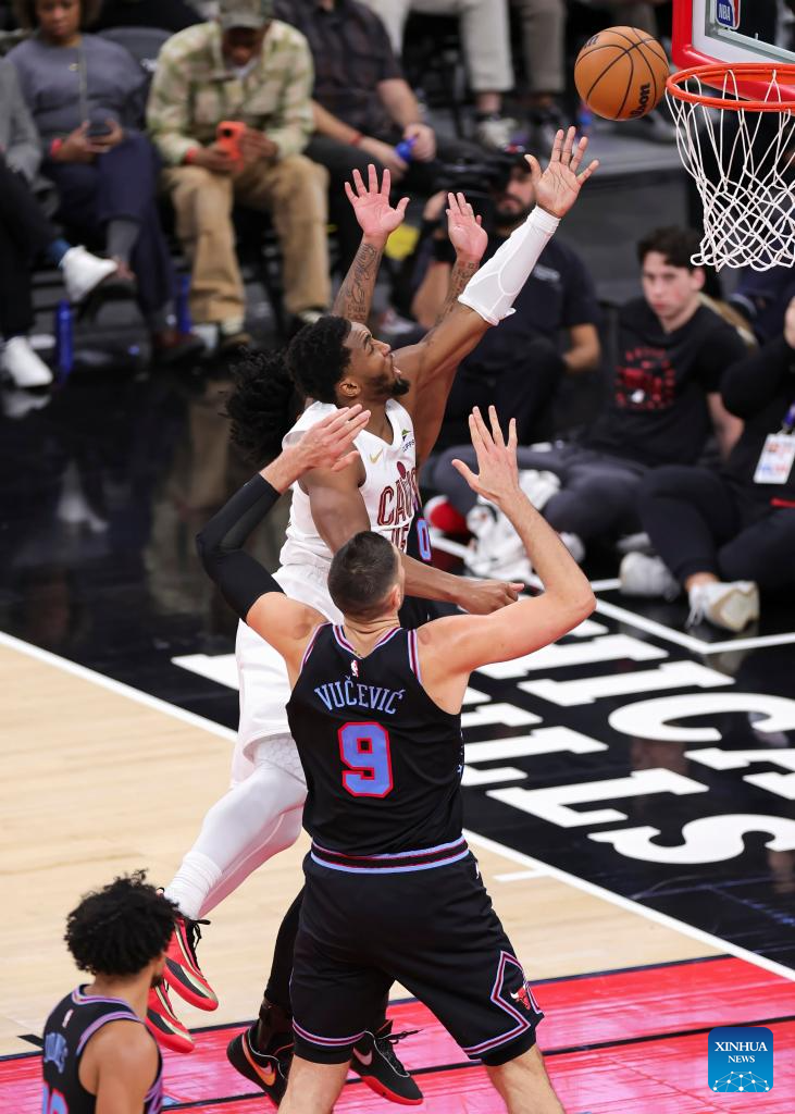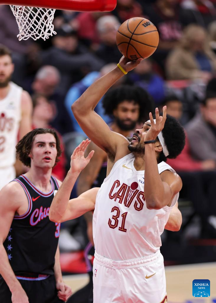 Cleveland Cavaliers' Jarrett Allen (front) drives to the basket during the 2025-2026 NBA regular season match between Chicago Bulls and Cleveland Cavaliers in Chicago, the United States, on Dec. 17, 2025. (Photo by Joel Lerner/Xinhua)