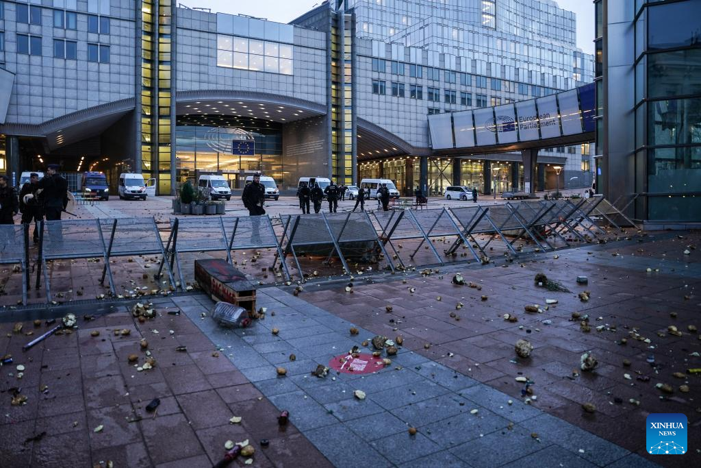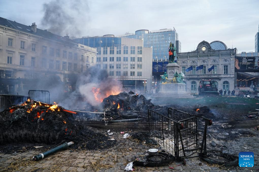 This photo taken on Dec. 18, 2025 shows a view after a farmers' protest in Brussels, Belgium. Thousands of farmers from across Europe rallied near the European Parliament and the Europa Building in Brussels on Thursday as European Union (EU) leaders convened for a summit, with a long-negotiated trade deal with the South American bloc Mercosur on the agenda. (Xinhua/Peng Ziyang)