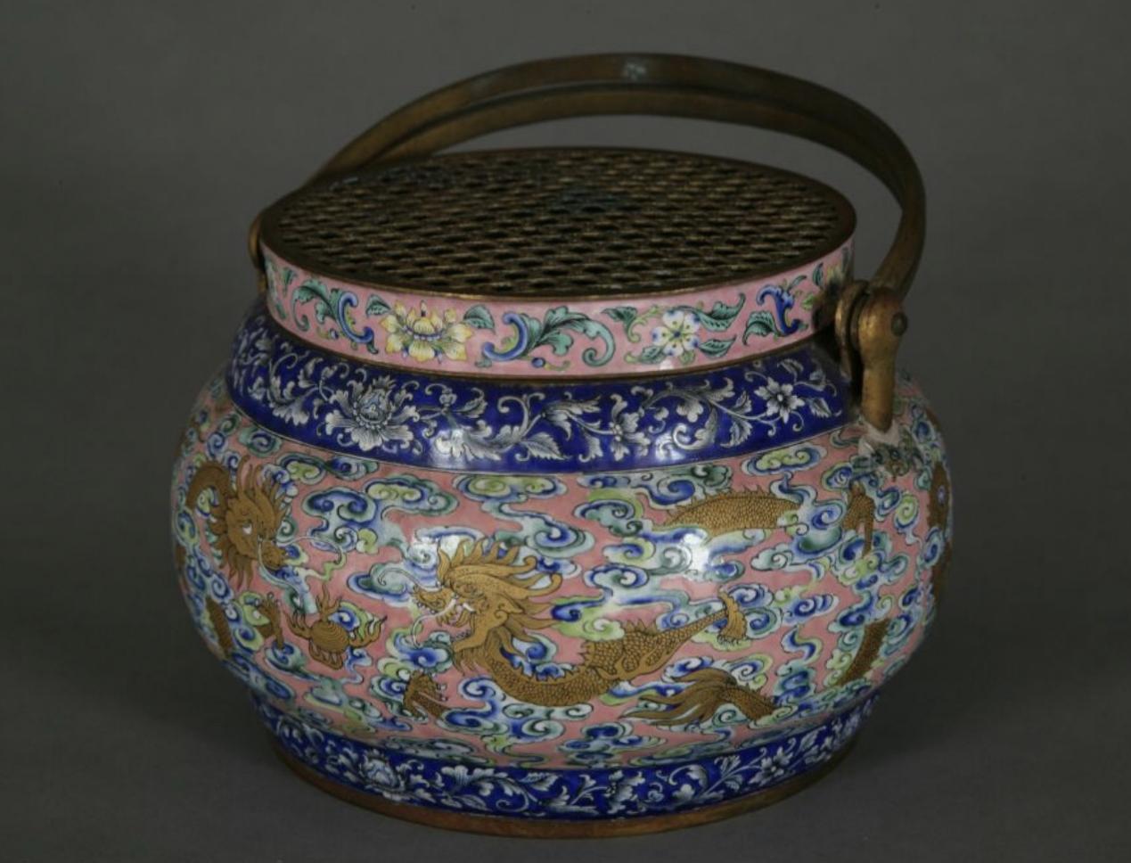 Painted enamel "cloud-and-dragon" round hand warmer. (Screenshot from the Palace Museum official website)