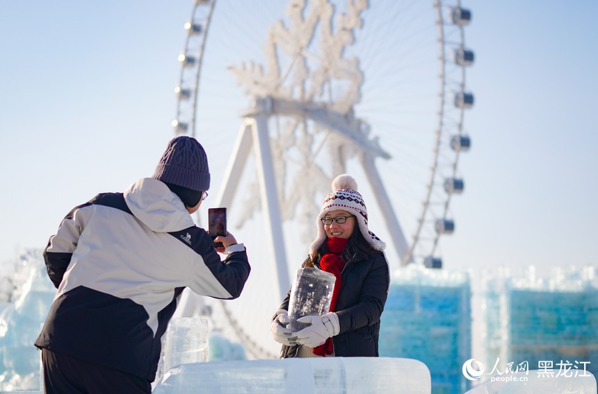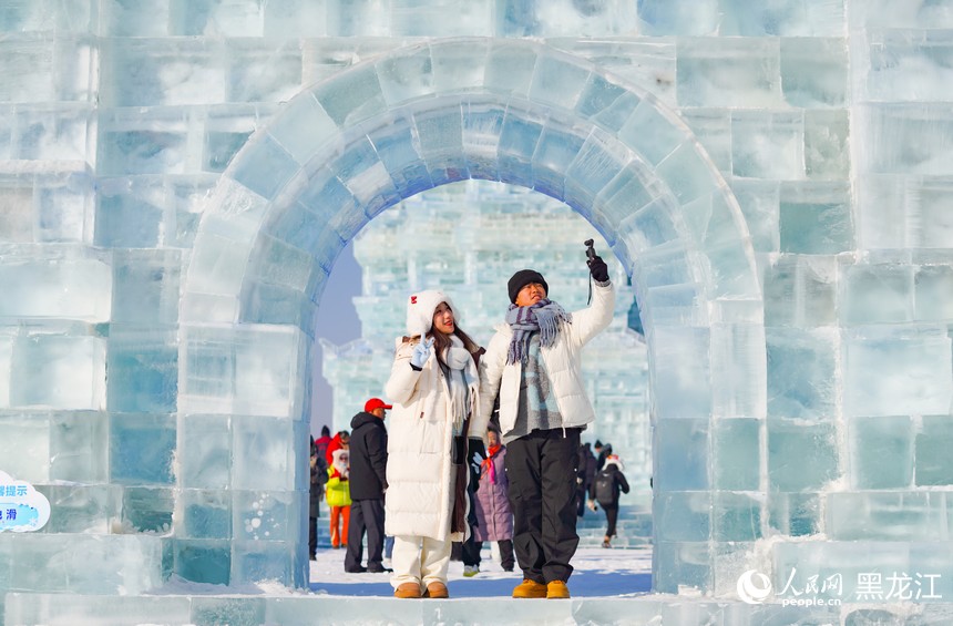 Tourists take photos at the 27th edition of the Harbin Ice-Snow World, a renowned seasonal theme park in Harbin city, northeast China's Heilongjiang Province. (Photo/People's Daily Online)