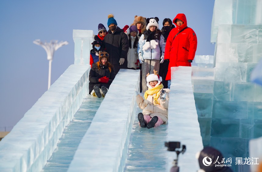 Tourists experience the super ice slides at the 27th edition of the Harbin Ice-Snow World, a renowned seasonal theme park in Harbin city, northeast China's Heilongjiang Province. (Photo/People's Daily Online)