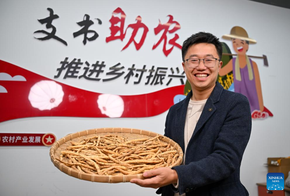 Xie Aijun, Party secretary of Xinghua Village, presents local produce at a "Party secretary studio for rural development" in Cangxi County of Guangyuan City, southwest China's Sichuan Province, Dec. 12, 2025. Cangxi County has crafted an innovative model to boost rural development, which incorporates family farming cooperatives, live-streaming platforms as well as online and offline marketing.