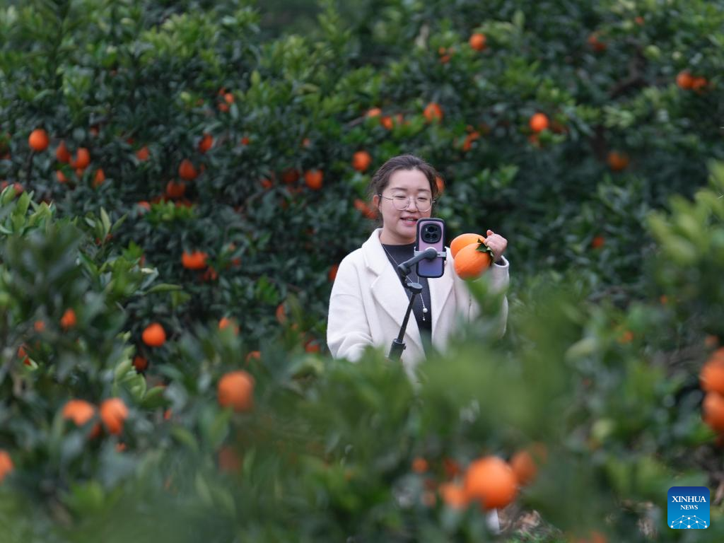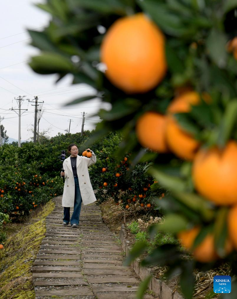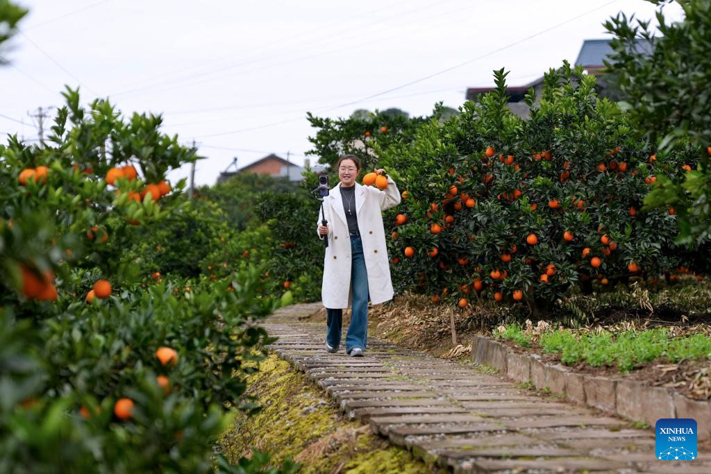 Zhang Guihua, Party secretary of Sunzigou Village, promotes oranges via live-streaming at an orchard in Cangxi County of Guangyuan City, southwest China's Sichuan Province, Dec. 12, 2025. Cangxi County has crafted an innovative model to boost rural development, which incorporates family farming cooperatives, live-streaming platforms as well as online and offline marketing.