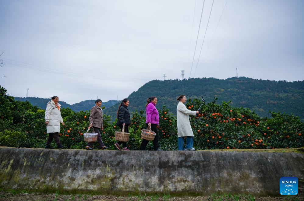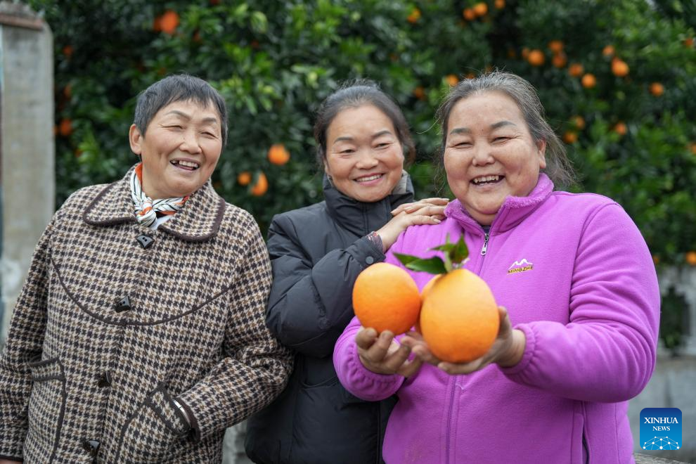 Villagers present newly harvested oranges at Sunzigou Village in Cangxi County of Guangyuan City, southwest China's Sichuan Province, Dec. 12, 2025. Cangxi County has crafted an innovative model to boost rural development, which incorporates family farming cooperatives, live-streaming platforms as well as online and offline marketing.