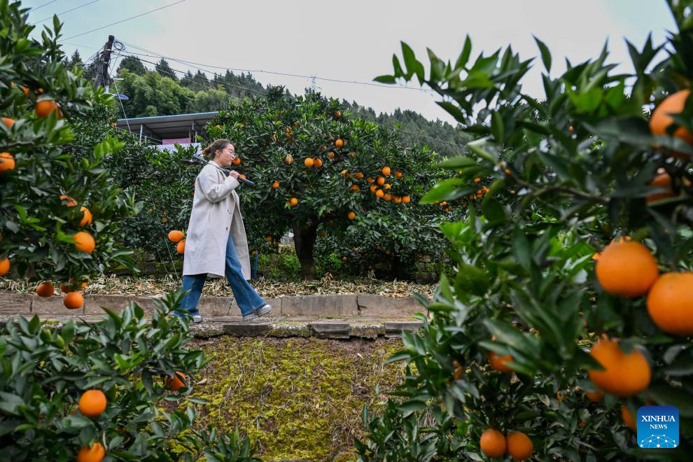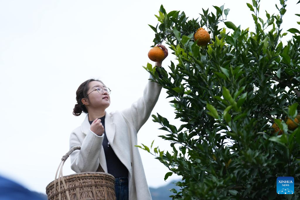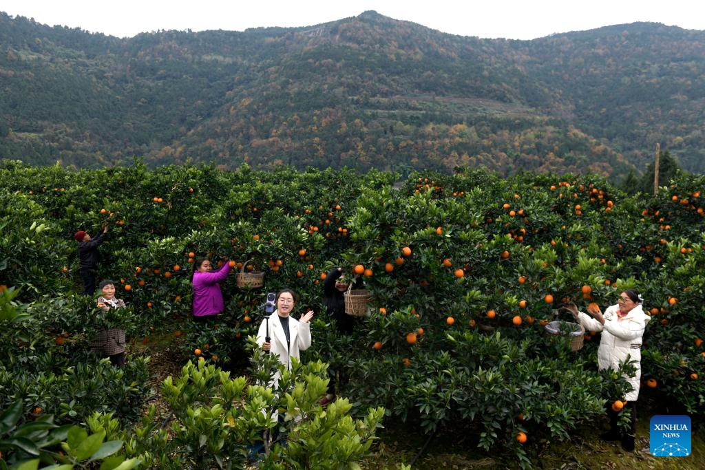 Zhang Guihua, Party secretary of Sunzigou Village, picks oranges at an orchard in Sunzigou Village in Cangxi County of Guangyuan City, southwest China's Sichuan Province, Dec. 12, 2025. Cangxi County has crafted an innovative model to boost rural development, which incorporates family farming cooperatives, live-streaming platforms as well as online and offline marketing.