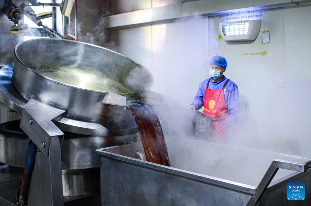 A worker processes products at a condiment company in Yang'an County of Laoling City, east China's Shandong Province, Dec. 18, 2025. The tiny town of Yang'an in Laoling, a county-level city, has built a seasoning empire that reaches over 70 countries and regions, and has captured 40 percent of China's composite spice market.
