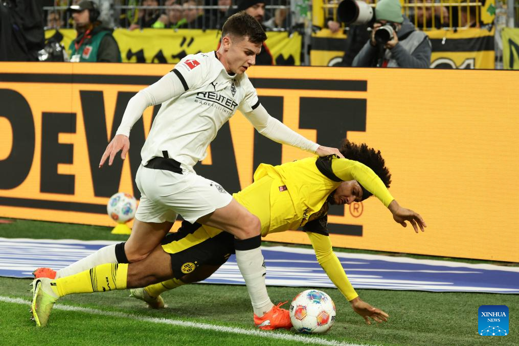 Karim Adeyemi (R) of Borussia Dortmund vies with Florian Neuhaus of Borussia Moenchengladbach during the German first division Bundesliga football match between Borussia Dortmund and Borussia Moenchengladbach in Dortmund, Germany, Dec. 19, 2025. (Photo by Joachim Bywaletz/Xinhua)