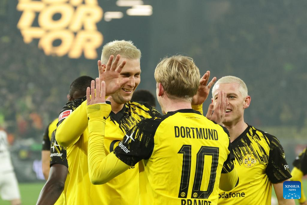 Julian Brandt (front) of Borussia Dortmund celebrates scoring during the German first division Bundesliga football match between Borussia Dortmund and Borussia Moenchengladbach in Dortmund, Germany, Dec. 19, 2025. (Photo by Joachim Bywaletz/Xinhua)