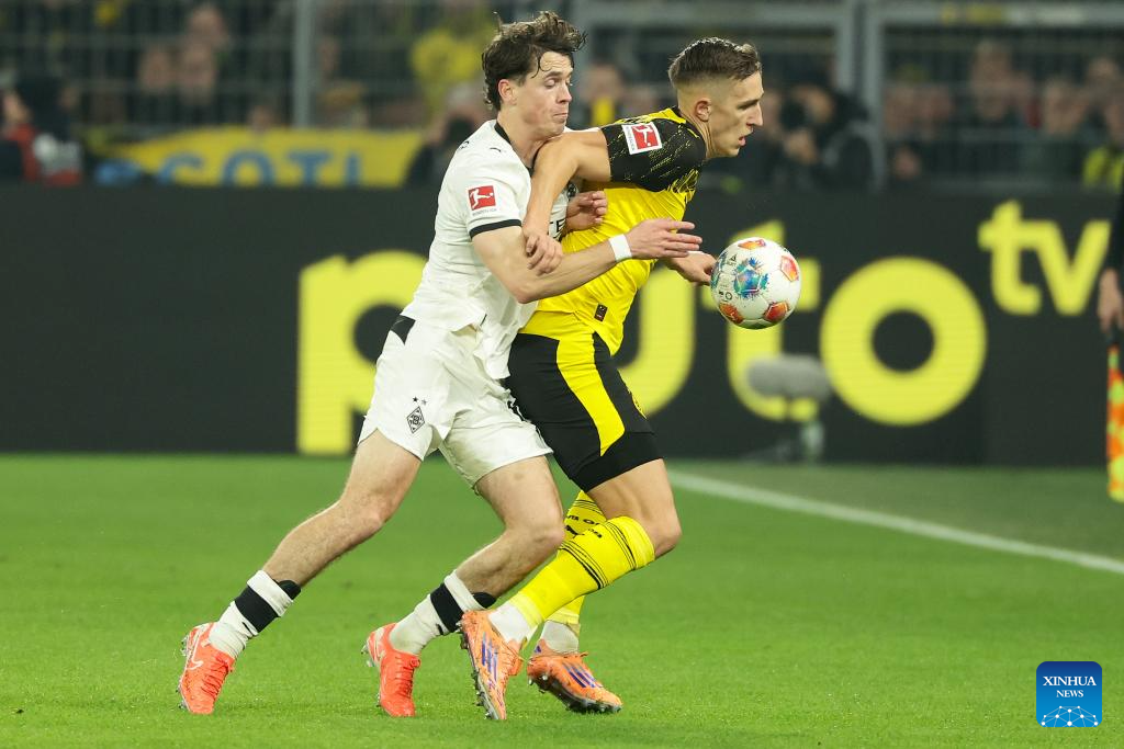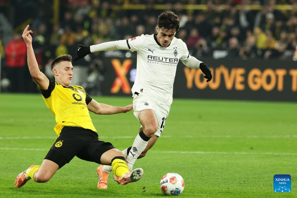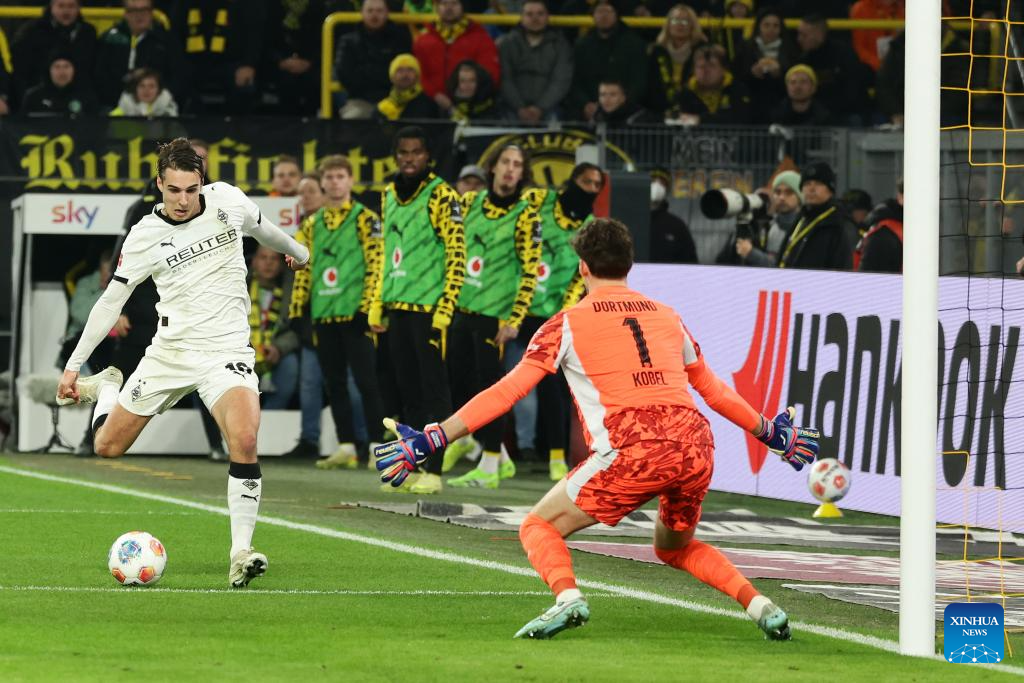 Florian Neuhaus (L) of Borussia Moenchengladbach shoots during the German first division Bundesliga football match between Borussia Dortmund and Borussia Moenchengladbach in Dortmund, Germany, Dec. 19, 2025. (Photo by Joachim Bywaletz/Xinhua)
