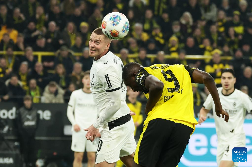 Serhou Guirassy (R) of Borussia Dortmund and Nico Elvedi of Borussia Moenchengladbach head for the ball during the German first division Bundesliga football match between Borussia Dortmund and Borussia Moenchengladbach in Dortmund, Germany, Dec. 19, 2025. (Photo by Joachim Bywaletz/Xinhua)
