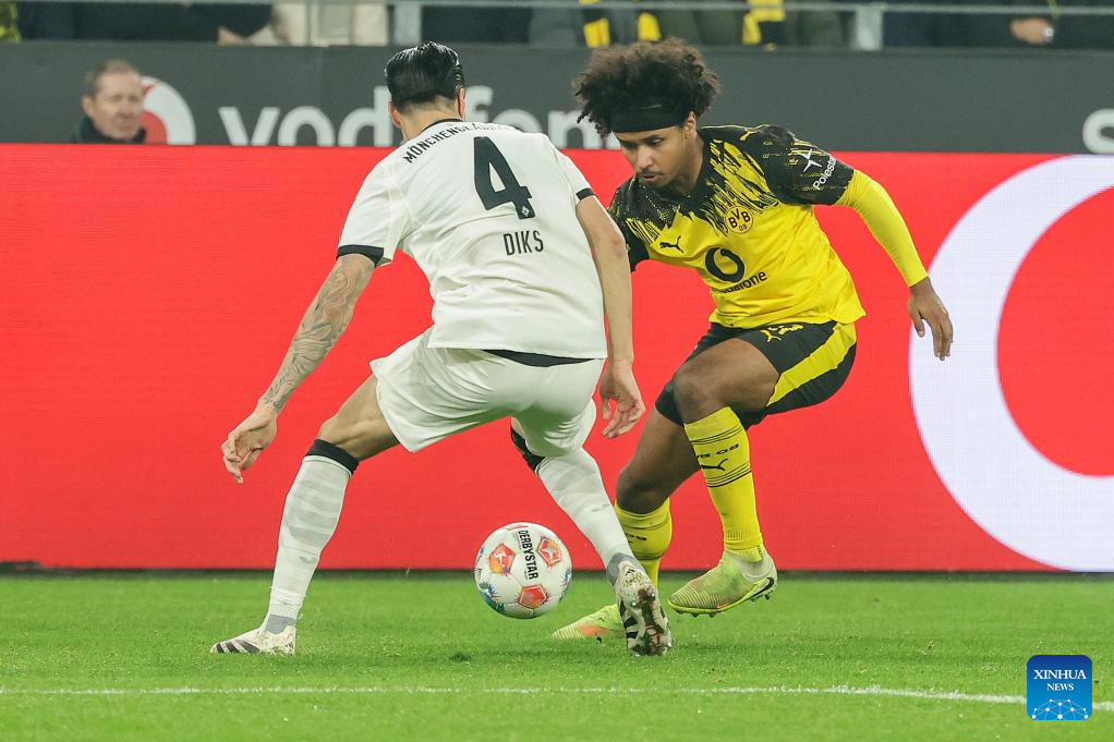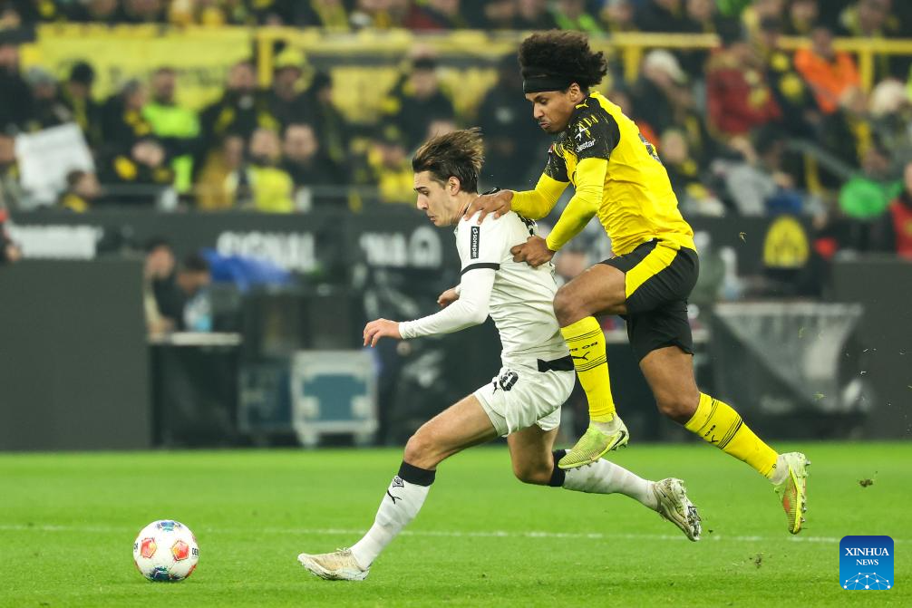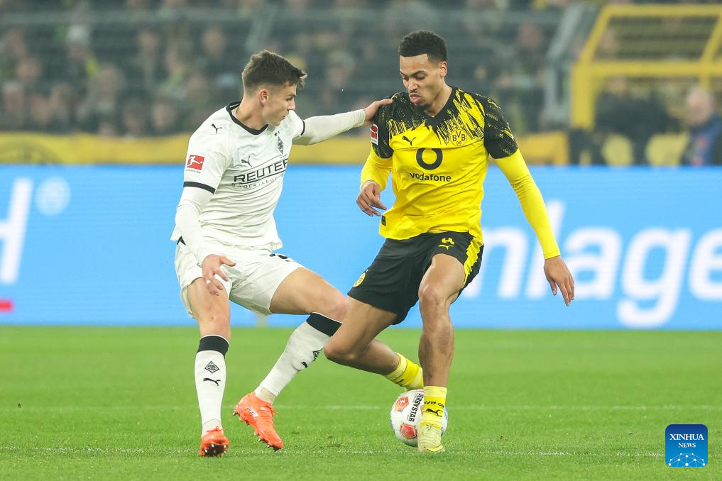 Daniel Svensson (L) of Borussia Dortmund vies with Joe Scally of Borussia Moenchengladbach during the German first division Bundesliga football match between Borussia Dortmund and Borussia Moenchengladbach in Dortmund, Germany, Dec. 19, 2025. (Photo by Joachim Bywaletz/Xinhua)