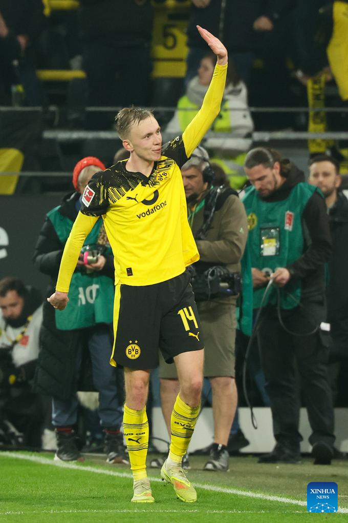Maximilian Beier of Borussia Dortmund celebrates scoring during the German first division Bundesliga football match between Borussia Dortmund and Borussia Moenchengladbach in Dortmund, Germany, Dec. 19, 2025. (Photo by Joachim Bywaletz/Xinhua)