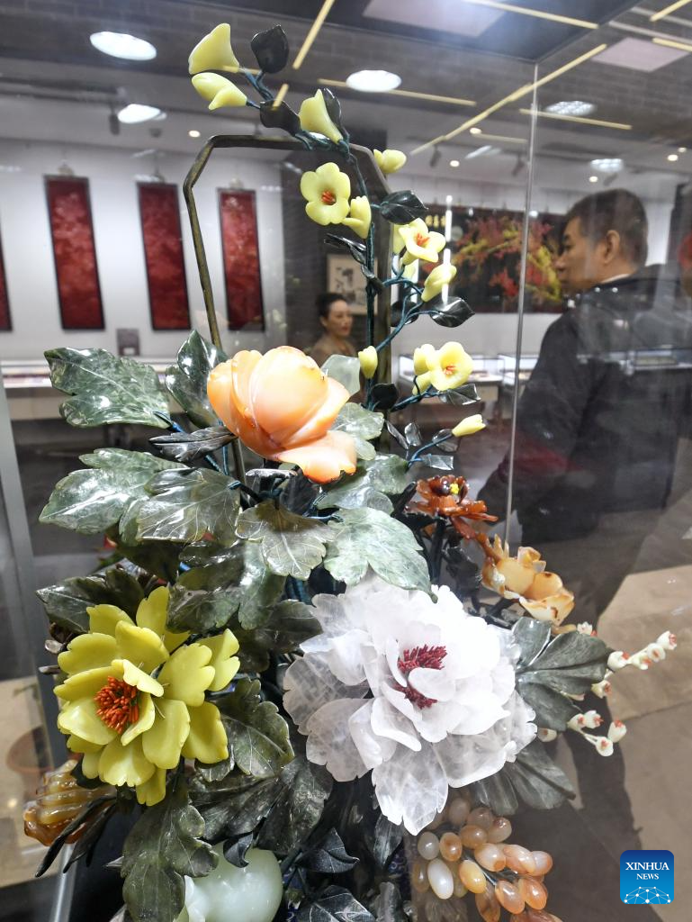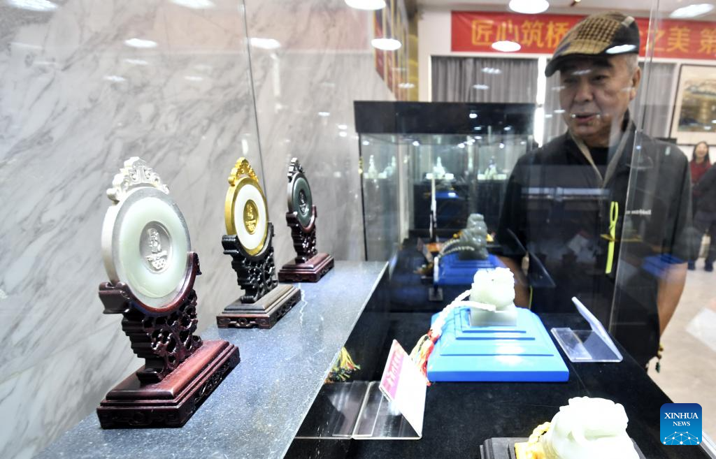 A visitor views a piece of jade carving work at an exhibition of intangible cultural heritages in Beijing, capital of China, Dec. 19, 2025. The exhibition showcases more than 500 pieces of artworks by inheritors of intangible cultural heritages nationwide. (Xinhua/Li Xin)