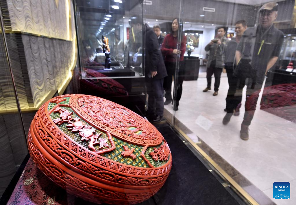 Visitors view a piece of carved lacquer work at an exhibition of intangible cultural heritages in Beijing, capital of China, Dec. 19, 2025. The exhibition showcases more than 500 pieces of artworks by inheritors of intangible cultural heritages nationwide. (Xinhua/Li Xin)