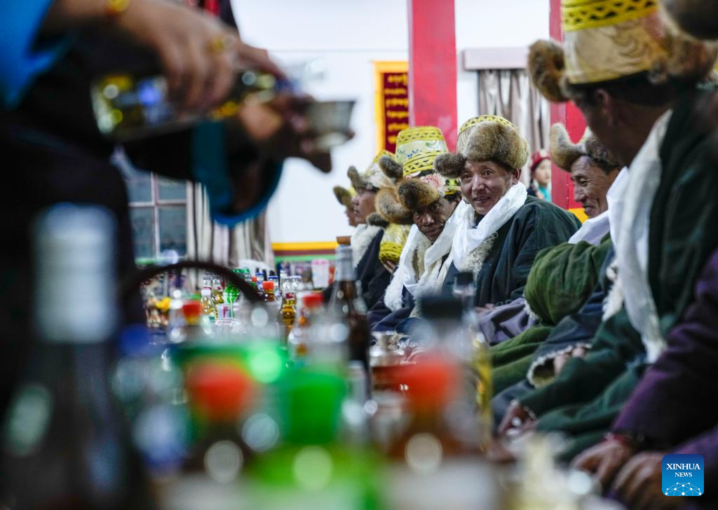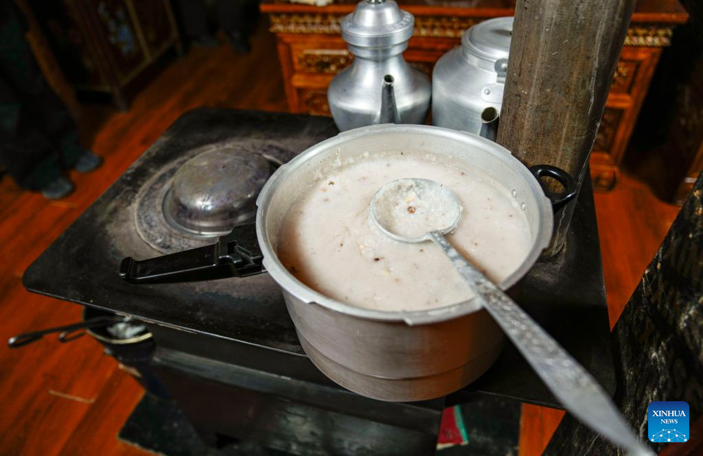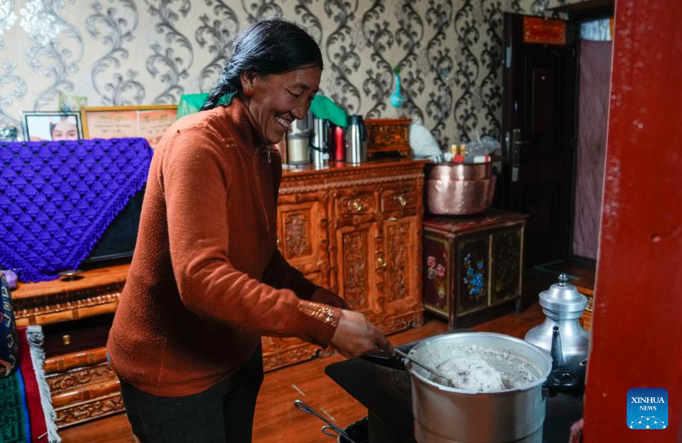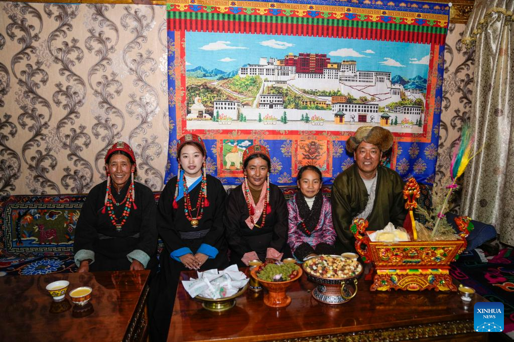 In Khorchak Village of Burang County, Jamyang Drolma's family is bustling with New Year preparations at home. A pot of "Gutu" steams on the stove, while the "chema," a two-tier rectangular wooden box containing roasted barley and fried wheat grain, is placed to pray for harvest in the next year. This year, the family rejoiced over a bumper harvest of highland barley and peas. "Life is getting better and better, and our New Year celebrations are becoming more lively each year," Jamyang Drolma said with a smile. (Xinhua/Tenzin Nyida)
